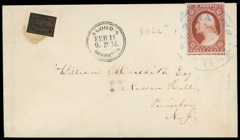 1851-52, 3¢ brownish carmine, type II, pos. three extra large margins, touched at right, intense shade, tied by blue "Philadelphia Pa., Feb 11" cds on amber cover bearing Bloods, 1¢ bronze on black (15L13) acid tied, sharp "Blood's Despatch, Feb. 11, 9. P.M." double-circle datestamp to Princeton N.J., an Extremely Fine Bloods to-the-mails use; with 2016 P.F. certificate.
