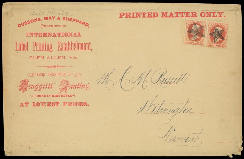 1875, 2¢ vermilion, C.B.N.C. printing, horizontal pair , each stamp canceled by Glen Allen printed star used on large oversized buff cover from Cussons, May & Sheppard in Glen Allen Va. with red "Printed Matter Only." printed endorsement at upper right, flap unsealed, pencil "Bill Heads" content docketing; some edge wear with corner fault, slight perf toning at bottom, Very Fine.