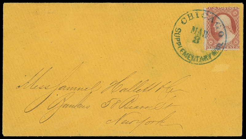 1857, 3¢ dull red, type III, tied by neat blue "Chicago, Supplementary Mail, Mar 8" cds on orange cover to New York City; minor abrasion spot, Extremely Fine and choice strike.