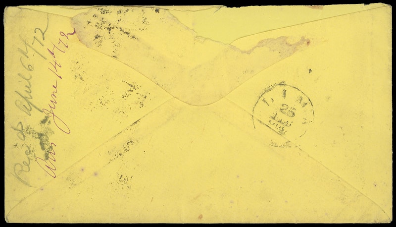 1870, 10¢ brown, N.B.N.C. printing, small tear, tied by cross roads cancel, matching "San Francisco Cal. Apr 4" cds on inbound yellow cover from Peru to San Francisco Cal., bearing Peru 1d green (14) tied by roller cancel, matching "Lima, 25 Feb" origin cds, and Great Britain 9d straw (A43) tied by Panama "C35" barred oval, matching partial "Panama, Mar 5, 72" transit cds, San Francisco "Steam, Panama" oval indicating origin of inbound steamship, 1872 receipt docketing on reverse; partial flap and tiny edge tear at top, Very Fine.