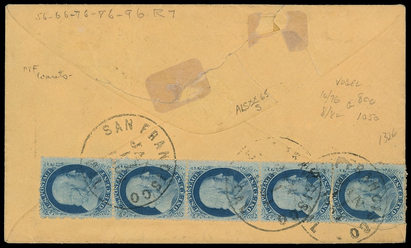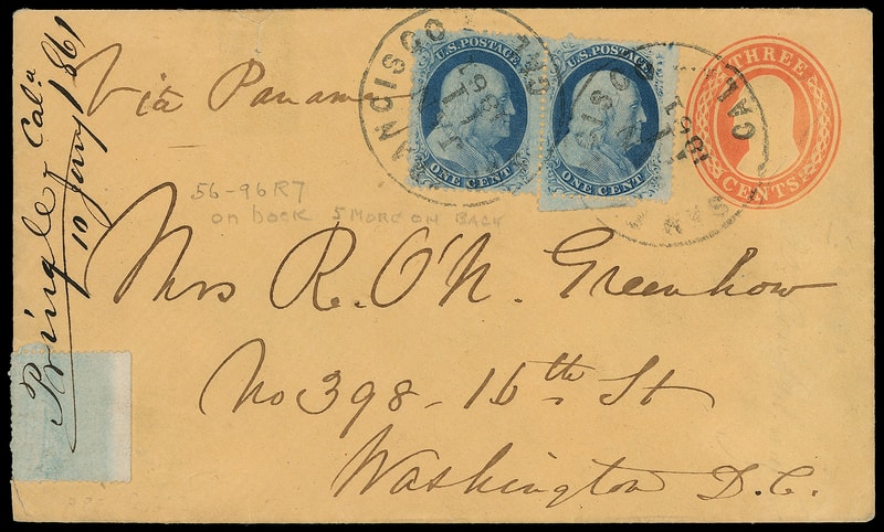 1857, 1¢ blue, type V, pair and vertical strip of five (pos. 56-96R7) on reverse with selvage folded over, all rich color and tied by neat "San Francisco Cal. Jan 11, 1861" cds strikes on 3¢ red (U10) Nesbitt buff entire to Washington D.C. at the 10¢ rate, endorsed "Via Panama" at top left, 1861 receipt docketing; flap tears and small 1¢ flaws, Very Fine and attractive 1857 Issue use.