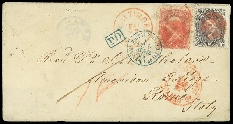1863, 24¢ grayish lilac, used with 3¢ red, E grill (88), each tied by vivid red quartered cork duplexed with "Baltmore Md. Mar 27" cds to Rome, Italy , red "New York, Paid All, Br. Transit, Mar 28" exchange cds and red crayon "18" cent credit, blue Calais (4.9.68) transit also ties 3¢ and matching small "PD" framed handstamp, Rome (4.13) arrival backstamp, Very Fine and striking Baltimore red foreign mail use.
