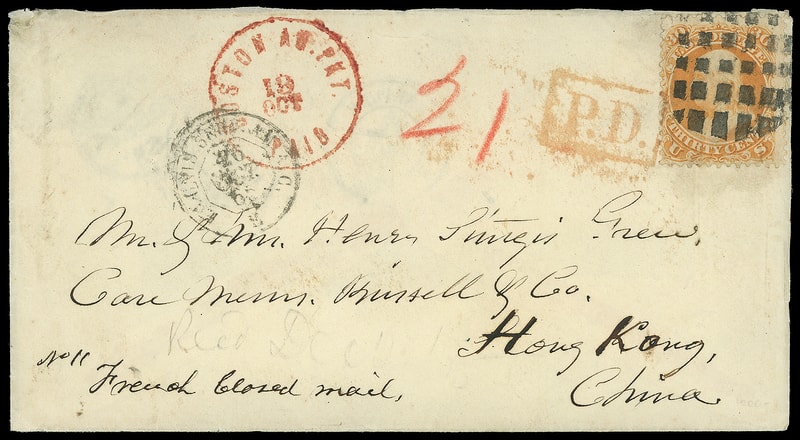 1861, 30¢ orange, tied by bold circular grid, red "Boston Am. Pkt. 'Paid' 19 Oct" exchange cds and red crayon "21" credit on 1865 cover to Hong Kong, China , endorsed "French Closed Mail" at lower left, Calais (10.26) transit cds and red "P.D." framed handstamp also ties 30¢, reverse with Marseilles (10.27) transit and Hong Kong (12.12) arrival backstamp; couple small 30¢ flaws, Very Fine.