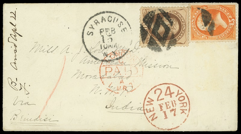 1873, 15¢ yellow orange, C.B.N.C. printing, radiant color, used with 10¢ brown (161) , tied by "Compass" Masonic fancy cancel duplexed with "Syracuse N.Y. Feb 15" cds to Moradabad, India , endorsed "Via Brindisi" at lower left, bold red "New York '24' Feb 17" credit handstamp, red London Paid (3.1.75) transit cds and red crayon "1" pence colonial credit, reverse with Sea Post Office (3.12) transit and Moradabad (3.28) arrival cds; 15¢ couple tiny flaws, Very Fine and attractive use to India.
