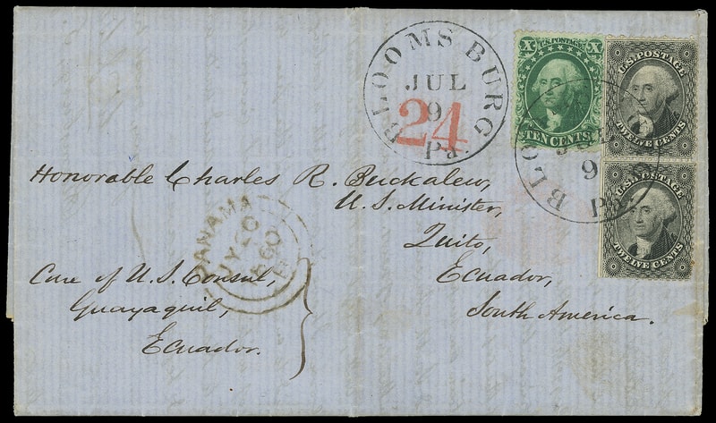 1857, 12¢ black, plate I, vertical pair, used with 10¢ green (33) , tied by well-struck "Bloomsburg Pa. Jul 9" cds on blue 1860 folded letter from Buckalew correspondence to Quito, Ecuador , New York red " 24 " credit handstamp, "Panama, JY 20, 1860" transit datestamp; few lightly toned perf tips at right, Very Fine and scarce use, ex-Lebow .