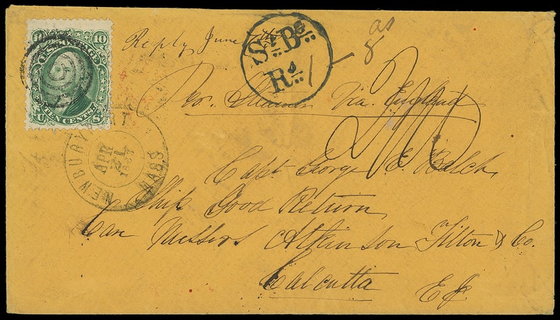 1861, 10¢ green, tied by four-ring target and "Newburyport, Mass. Apr 21, 1863" cds on orange cover to Calcutta, India , endorsed "Per Steamer Via England", "Boston. Br. Pkt. Apr 21" exchange cds backstamp, carried by Cunard Africa from New York (4.22) to Queenstown arriving May 3rd, red London (5.4) transit backstamp and ms. " 2/10 " 2s10d debit rating for double-rate (68¢ = two-times: 34¢ rate plus 5¢ U.S), Calcutta G.P.O., JU 1, 1863" arrival backstamp with matching " St. Bg. Rs. " circular handstamp with ms. " 1 - 8as " rating for 1 rupee 8 annas; flap tear, Very Fine and scarce use at double the 5¢ British Open mail rate.