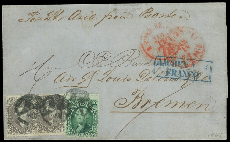 1863, 24¢ lilac, two singles, used with 10¢ green (68) , double perfs, each tied by Four-Point Star in Circle NYFM cancels, red "N.York. Br. Pkt. '7 Paid' Jan 17" overstruck with double-rate "N.York. Br. Pkt. '14 Paid' Jan 17" credit exchange cds on 1865 blue folded letter to Bremen, Germany , endorsed "Per Str Asia from Boston" at top, carried by Cunard Line Asia from Boston Jan. 18th to Queenstown arriving Jan. 30th, blue Aachen Franco (2.1) framed transit, Very Fine and attractive NYFM double-rate Prussian Closed Mail use to Bremen, ex-Hyzen, Skinner .