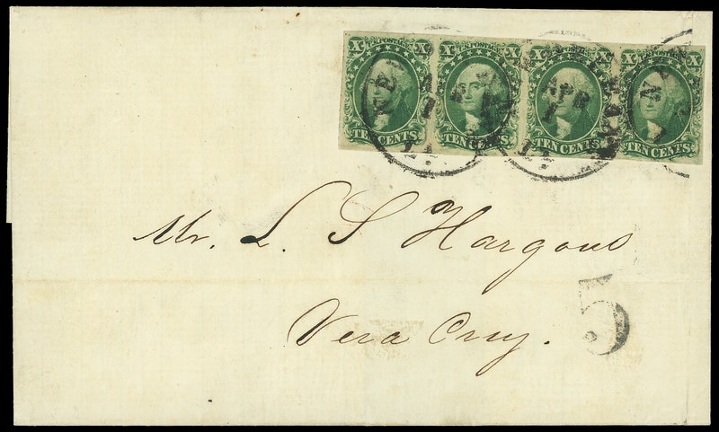 1855, 10¢ green, type II, horizontal strip of four , pos. 35-38R1, large margins except clear at right, tied by strikes of "New Orleans La. Apr 1" cds on 1856 folded cover from the Hargous correspondence to Vera Cruz, Mexico ; right stamp lightly creased from file fold, Very Fine use from the Hargous correspondence, ex-Judd, Provera .