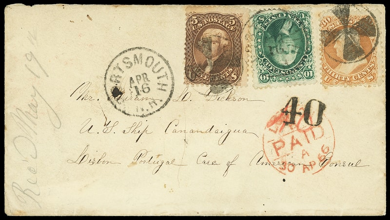 1861, 30¢ orange, used with 5¢ brown (76) and 10¢ green (68) , tied by unusual propeller in circle cancels duplexed with "Portsmouth N.H. Apr 16" cds on small 1866 cover to Lisbon, Portugal , red "Boston Br. Pkt. 'Paid' 17 Apr" exchange cds backstamp and red crayon "40" credit rating, carried on Cunard Line Cuba from New York Apr. 18th, red London Paid (4.30.66) transit cds, Lisbon (5.6) arrival backstamp and matching bold "40" Reis due handstamp overstriking red crayon credit, F.-V.F. and colorful use, ex-Gallagher, Gabriel (Angel) .