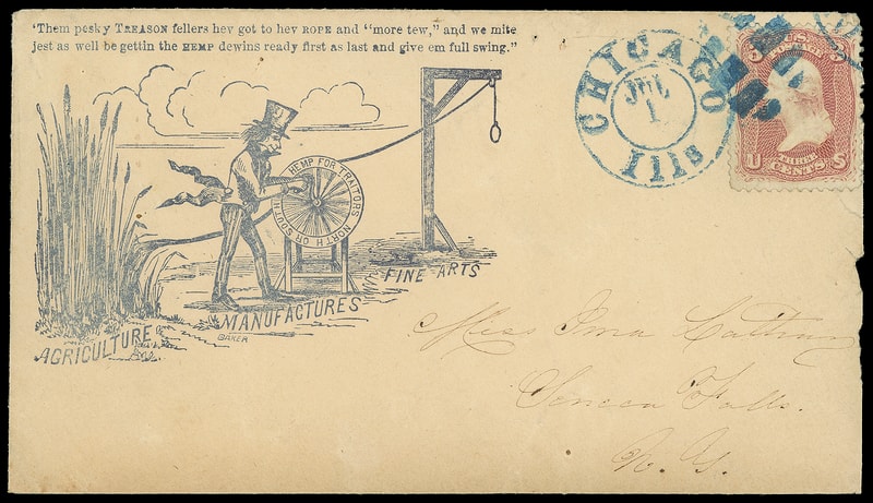 Agriculture, Manufactures, Fine Arts, slate blue Union caricature design with Uncle Sam Making Hangman's Rope using "Hemp for Traitors" on buff cover bearing 3¢ rose (65) tied by blue segmented grid and "Chicago Ills. Jul 1" cds to Seneca Falls N.Y.; slightly rough opening at right, F.-V.F. and rare patriotic hangman design. Walcott No. 911.