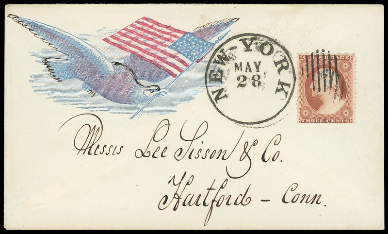 Eagle and Flag, beautiful patriotic design on fresh cover bearing 3¢ dull red (26) tied by open circular grid cancel duplexed with bold "New-York, May 28" cds beautifully addressed in script to Hartford Conn., sender also inked eagle; barely reduced at right, an Extremely Fine gem.