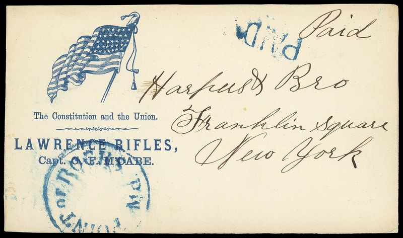 Flag and verse, "The Constitution and the Flag, Lawrence Rifles, Capt. G.F. M'Cabe", all in blue, on immaculate cover to New York City, blue "Point of Rocks, Md" undated cds and matching "Paid" straightline, Extremely Fine and choice.