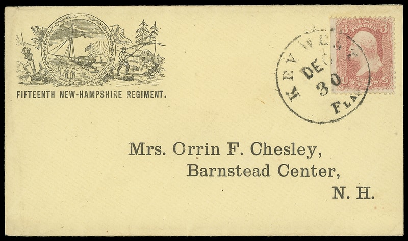 Fifteenth New-Hampshire Regiment., regimental patriotic design showing State Seal and wilderness scene on amber cover bearing 3¢ rose (65) tied by sharp "Key West, Fla. Dec 30" cds with preprinted address to Barnstead Center N.H.; reduced slightly at right, fresh and Extremely Fine patriotic use from Florida.