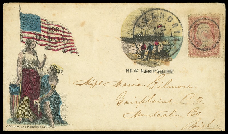 For the Union, New Hampshire, multicolor Magnus two-panel patriotic design showing seated Lady Liberty and State Seal on cover bearing 3¢ rose (65) tied by four-ring target cancel duplexed with "Alexandria Va. Aug 29, 1863" cds to Fairplains Mich.; barely reduced at right, Very Fine; with 1993 P.F. certificate.