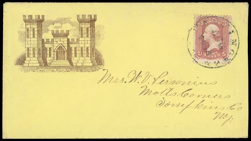 (Head Quarters, 50th Engineers) Castle, bronze patriotic design on yellow cover bearing 3¢ rose (65) tied by "Washington D.C. Aug 26, 1863" cds to Motts Corners N.Y., fresh and Very Fine.