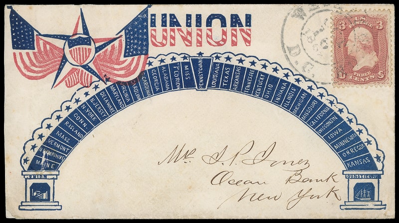 Union and States, red and blue patriotic design with Magee flap imprint on cover bearing 3¢ rose (65) tied by "Washington D.C. Oct 16, 1862" cds to New York City; reduced slightly at left, Extremely Fine.