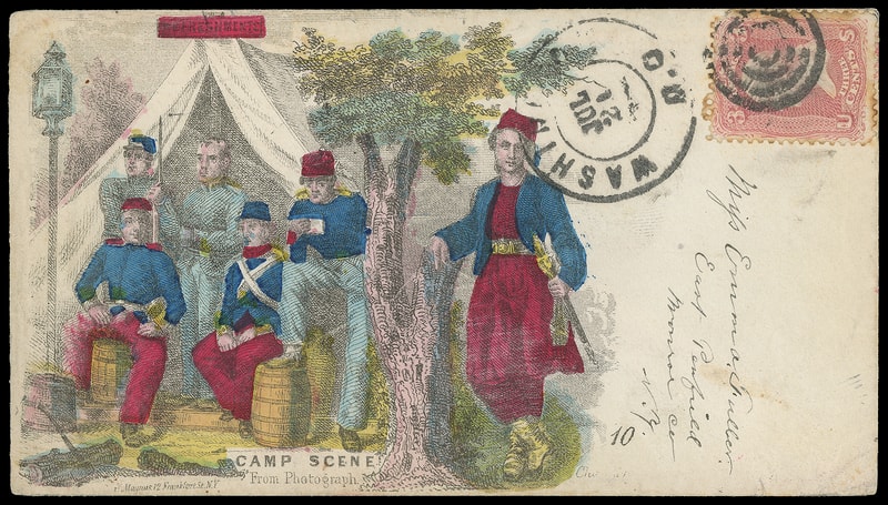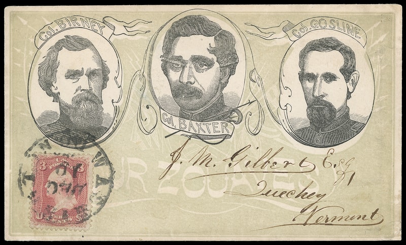 "Our Zouaves", light green and black overall design depicting Colonels Birney, Baxter and Gosline, Upham imprint on flap,on cover bearing 3¢ rose (65) tied by "Washington D.C. Dec 10" cds to Quechee Vt., Extremely Fine and choice, ex-Jarrett ; 1995 P.F. certificate no longer accompanies.
