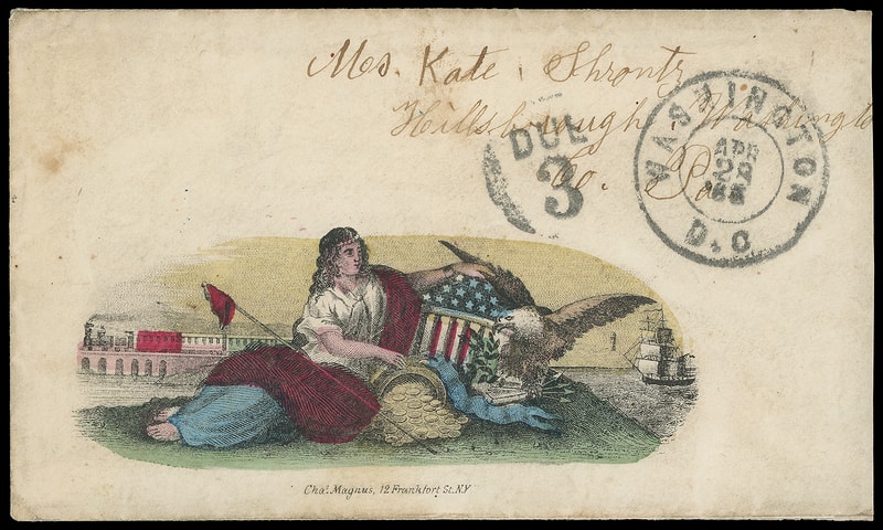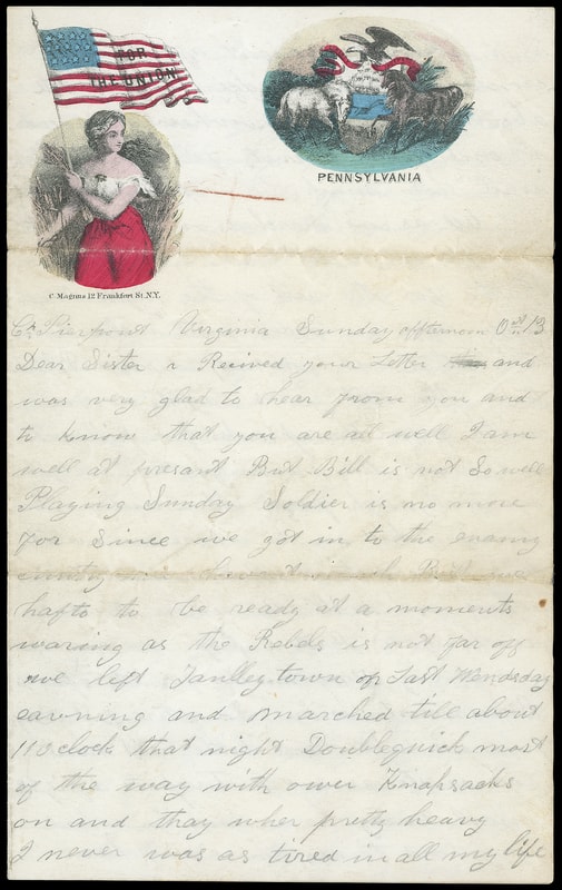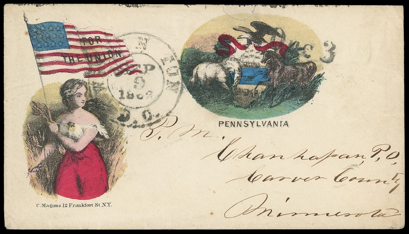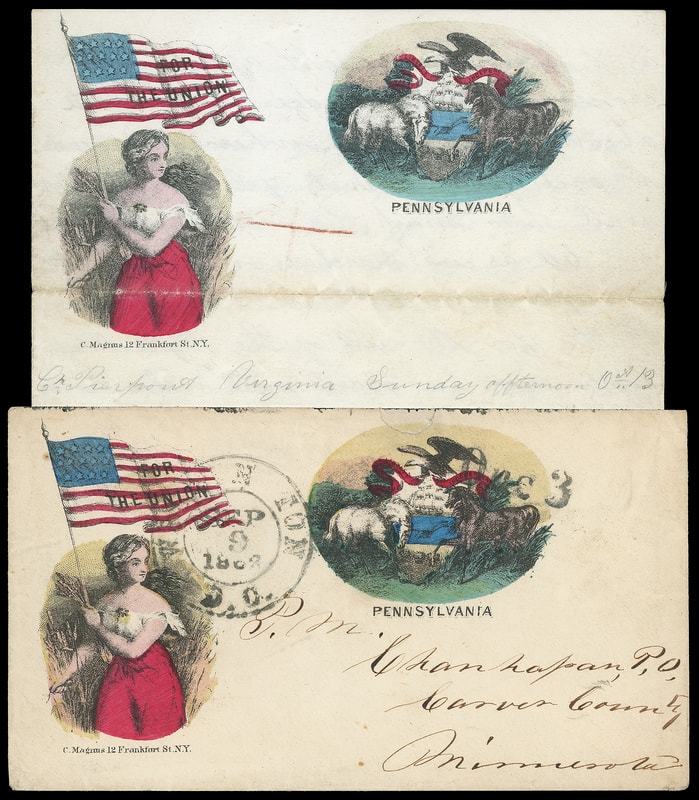 For the Union, Pennsylvania, multicolor Magnus two-panel patriotic design showing Lady and State Seal on cover with "Washington D.C. Sep 9, 1862" cds and matching "Due 3" rating handstamp to Postmaster at Chanhassen, Minnesota; small opening tear at top, partial flap; accompanied by matching non-original Magnus For the Union, Pennsylvania lettersheet datelined " Cr. Pierpoint Virginia Sunday afternoon Oct. 13 " with some health and camp life content mentioning " …Playing Sunday Soldier is no more fun since we got in to the enemy country we have run much but we hafto to be ready at a moments warning as the Rebels is not far off…we antisapate a fight almost every hour… "; some fold wear affects vignette, F.-V.F. and scarce Magnus pair.