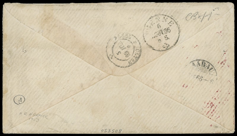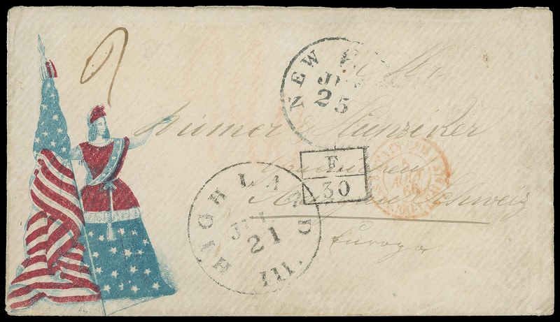 Standing Liberty with Flag, red and blue patriotic design on 1866 cover with "Highland Ill. Jul. 21" cds to Aarau, Switzerland , "New York '6' Jul 25" debit exchange cds, red Calais (8.5) transit cds and framed "F. 30" accountancy handstamp, reverse with Bienne (8.5.66) transit and Aarau arrival cds; opened on three sides for display, fresh and Very Fine patriotic transatlantic use.