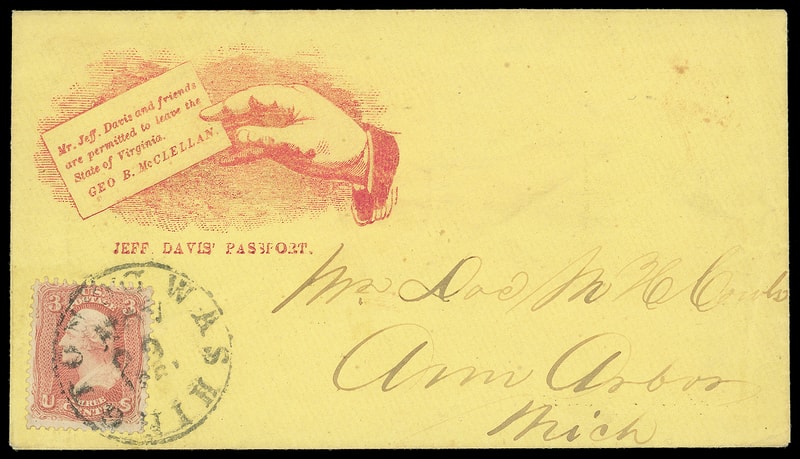 Jeff Davis's Passport, red patriotic design with hand holding "Mr. Jeff. Davis and friends are permitted to leave the State of Virginia. Geo. B. McClellan." card on yellow cover bearing 3¢ rose (65) tied by "Washington D.C. Nov 29, 1861" cds to Ann Arbor Mich., Very Fine and choice.