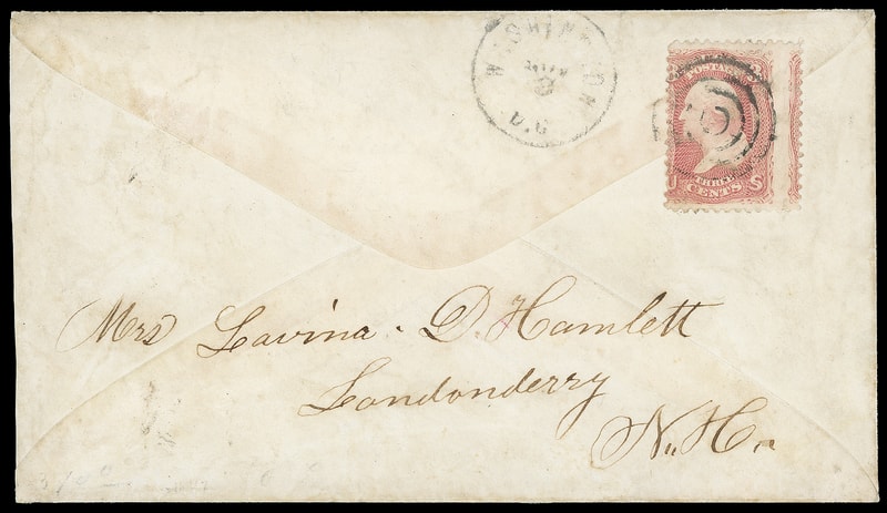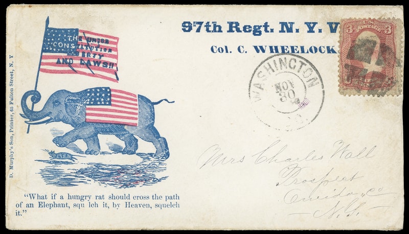 "97th Regt. N.Y.V., Col. C. Wheelock", red and blue patriotic design featuring elephant wearing flag and carrying additional flag with verse , Murphy & Sons imprint at left, on cover bearing 3¢ rose (65) , sealed tear, just tied by quartered cork duplexed with "Washington D.C., Nov 30" cds to Prospect N.Y.; reduced slightly at right, Very Fine and rare regimental design; with 2025 P.F. certificate.
