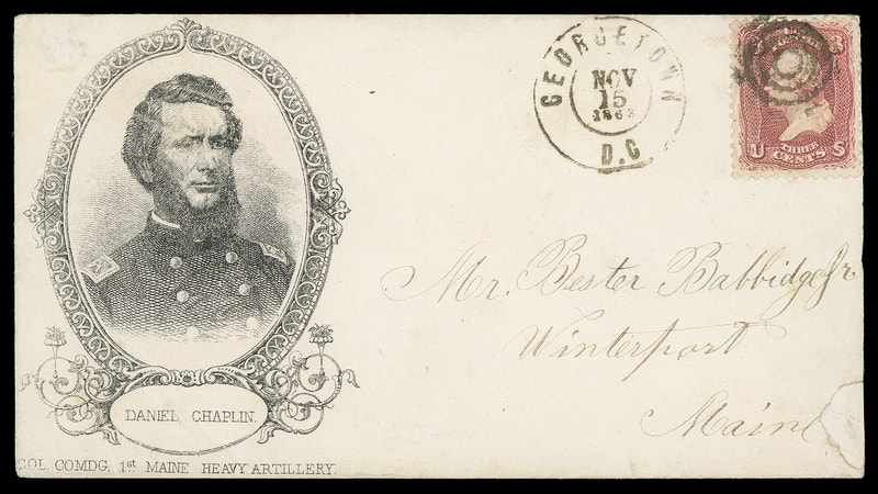 Daniel Chaplin., Col. Comdg. 1st Maine Heavy Artillery, Magnus portrait in ornate oval frame design, on cover bearing 3¢ rose (65) tied by target cancel, matching "Georgetown, D.C., Nov 15, 1862" cds to Winterport, Me., 1861; tear at lower right not mention on certificate, still Very Fine, ex-Gabriel, Bischel, Milgram ; with 1994 P.F. certificate.
