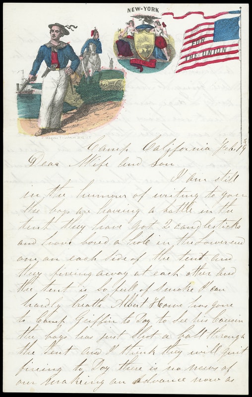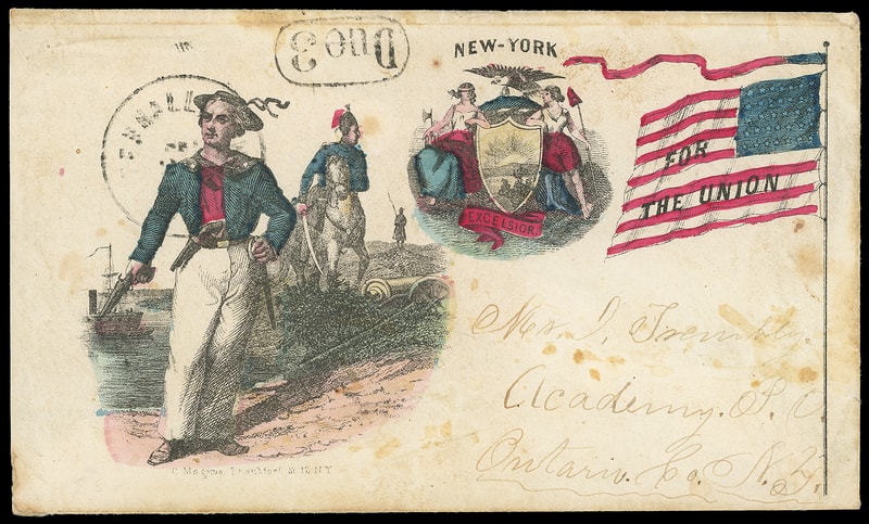For the Union, New York, multicolor Magnus two-panel patriotic design showing sailor and state seal on cover with "Tenallytown D.C. Sep. 20" cds and matching "Due 3" oval rating handstamp to Academy N.Y., scatterted tone spots, reduced slightly at left; accompanied by non-original matching multicolor Magnus "For the Union, New York" lettersheet datelined "Camp California Feb. 19th" from soldier to his wife back home with some interesting camp content including " …trying our bayonets with the Rebels if they will only stand and not run, as near as I can learn we are going to advance on Manassas and if we do we got to conquer and not to run… " and talks of a recent 64th New York Regiment recruit in camp for about a month turning out to be a woman, Very Fine and rare Magnus design pair.