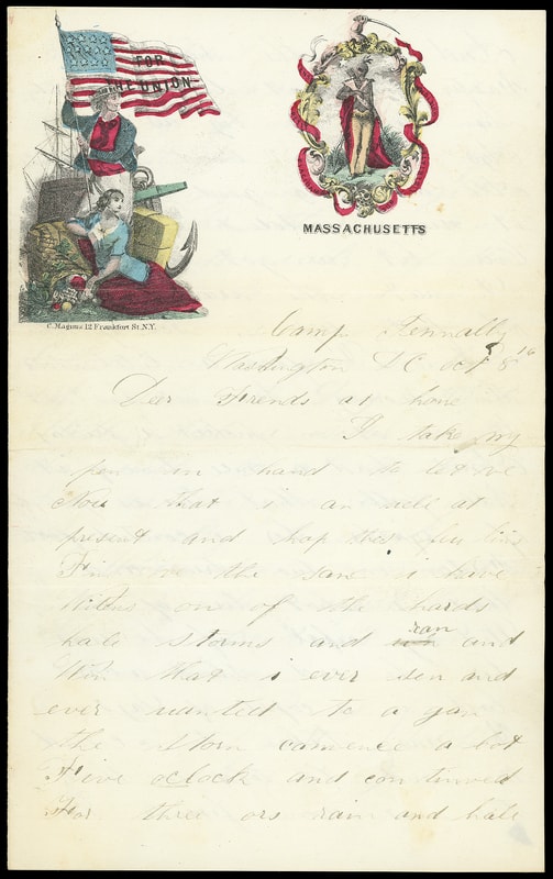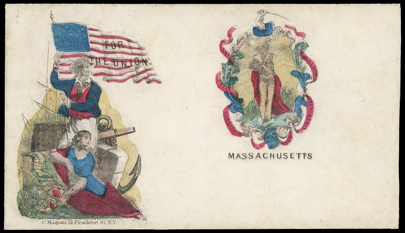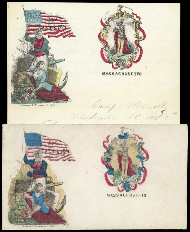 For the Union, Massachusetts, multicolor Magnus two-panel patriotic design showing Sailor with Lady Liberty and State Seal on cover bearing on reverse 3¢ rose (65) , missperfed, tied by "Washington D.C. Nov 9" cds to Londonderry N.H., accompanied by non-original matching multicolor Magnus "For the Union, Massachusetts" lettersheet datelined " Camp Tennally, Washington D.C. Oct 8 " from soldier to friends back home mentioning large hale storm and hunting squirrels in camp and "…the men cant git any whiskey to drink…" signed by Pratt Baldwin, Very Fine and rare matching Magnus patriotic; with 1997 P.F. certificate.