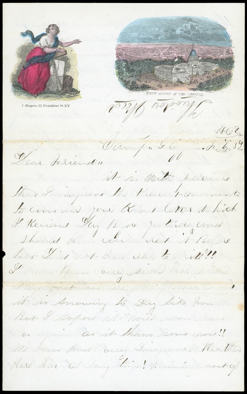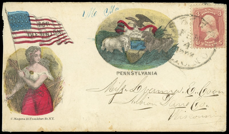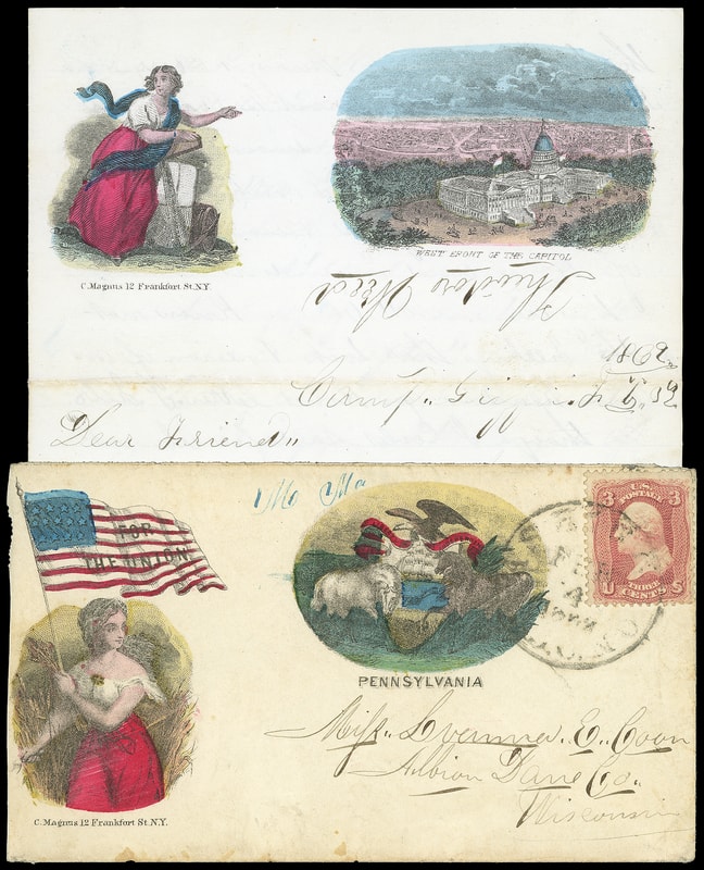 For the Union, Pennsylvania, multicolor Magnus two-panel patriotic design showing Female and State Seal on cover bearing 3¢ rose (65) couple short perfs, tied by "Washington D.C. Feb 5, 1862" cds to Albion Wisc., reduced at left; accompanied by original multicolor Magnus two-panel patriotic design lettersheet showing Female and U.S. Capitol datelined " Camp Griffin, Feby 3d, 1862 " mostly concerning deep snow, health and news of friends, Very Fine and rare Magnus patriotic cover and lettersheet.