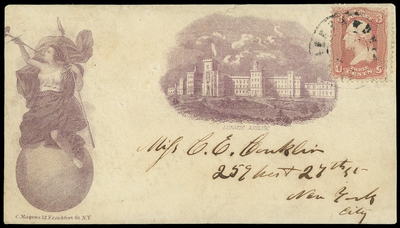 Lady Liberty and Lunatic Asylum, purple Magnus two-panel patriotic design on rebacked cover front bearing 3¢ rose (65) tied by partial "Alexandria Va." cds to New York City; reduced slightly, still Very Fine and rare used Magnus design; with 2025 P.S.E. certificate.