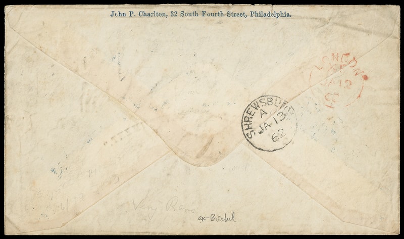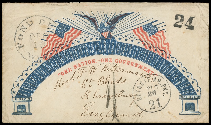 "One Nation - One Government" Eagle and Flags, red and blue patriotic design with Charlton flap imprint on 1861 cover with "Fond du Lac, Wis. Dec 18" cds with bold "24" rating handstamp to Shrewsbury, England , sharp "Detroit. Am. Pkt. '21' Dec 26" debit exchange cds, carried by Inman Line City of Washington from New York Dec. 28th 1861 to Liverpool arriving Jan. 9th, Liverpool "1/" one-shilling due handstamp (Tabeart M67), red London (1.12) entry backstamp, Shrewsbury (1.13) arrival backstamp; edge wear, Very Fine, ex-Bischel .