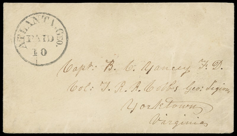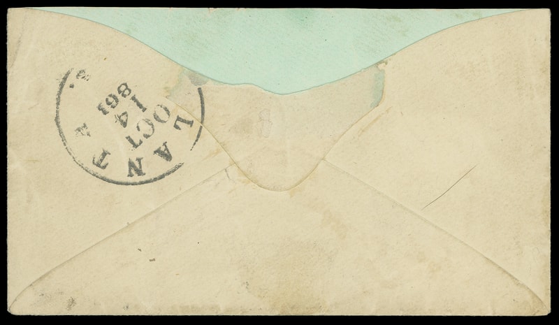 Atlanta, Ga., 1861, 10¢ black, clear circular provisional handstamp, "Atlanta Ga. Oct 14, 1861" cds backstamp on green-lined stationery with military address to Capt. B.G. Yancey F.D., Co. T.R.R. Cobb's Geo. Legion, Yorktown Va. ; missing flap, Very Fine.