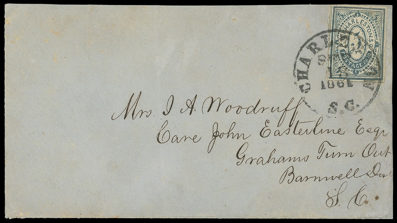 Charleston, S.C., 1861, 5¢ blue, full even margins with outer frameline at left, tied by "Charleston S.C. Sep 18, 1861" cds on blue cover to Graham's Turn Out S.C., Very Fine and choice early use, ex-Calhoun ; with 2014 P.F. certificate.