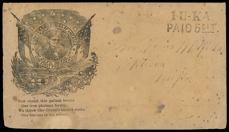 Iuka, Miss., 1861, 5¢ black, provisional handstamp on cover with Jefferson Davis Medallion patriotic design with verse below (JD-1C, verse 28) addressed to Artesia, Mississippi; cover soiling and fly specking, Fine and very rare patriotic use, ex-Judd .