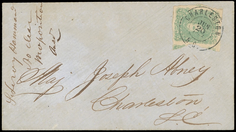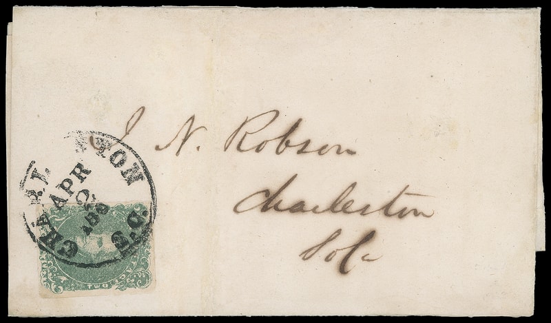 1862, 2¢ green, full to large margins, beautiful color, tied by "Charleston S.C. Apr 2, 1863" cds on folded printed circular from the Palmetto Exporting and Importing Co. to local Charleston address; lightly cleaned, Very Fine.
