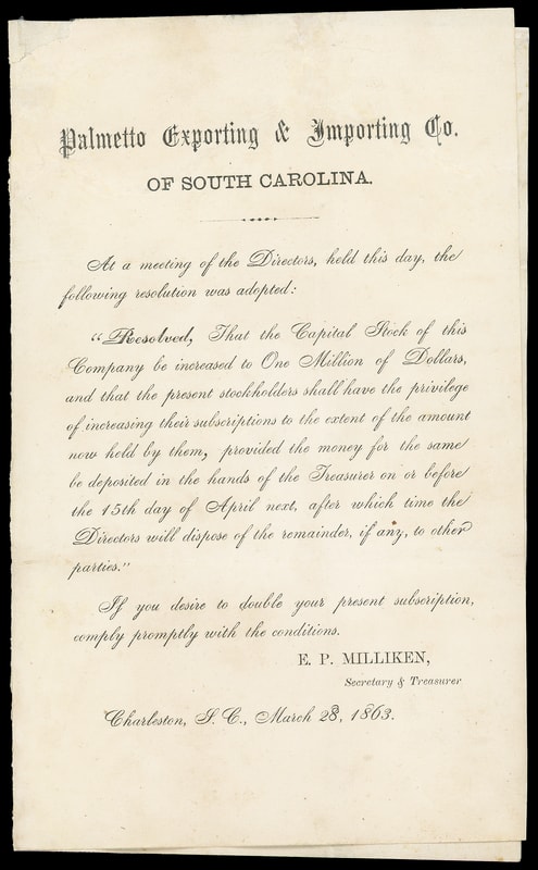The Palmetto Exporting and Importing Co. owned the ships Alice and Fannie that made 44 trips through the blockade. Famous Charlestonian William Ravenel was President.Lot 1238