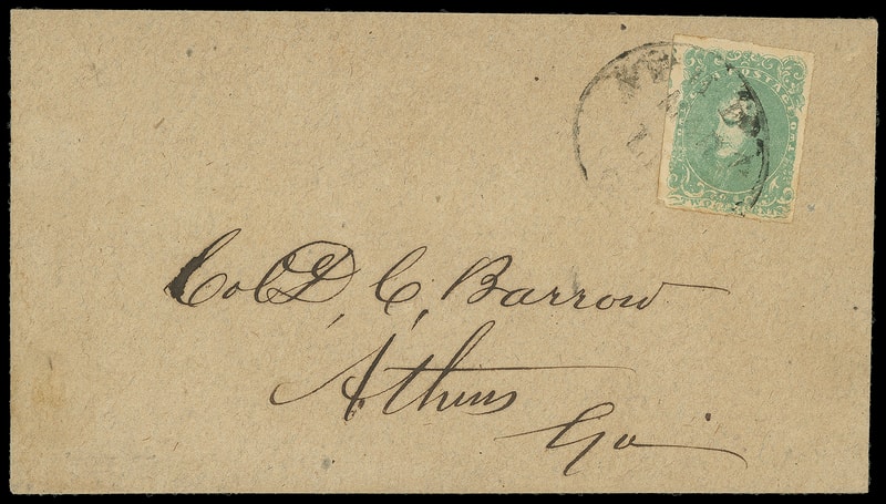 1862, 2¢ green, four full to large margins, tied by indistinct "Athens Ga. Mar" cds on homemade brown drop cover, Very Fine and scarce 2¢ Georgia drop use; with 2013 P.F. certificate.