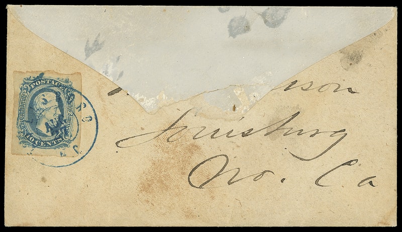 1863, 10¢ blue, large margins, rich color, tied by blue "Hillsboro N.C. Aug 27" cds on gray and dark gray floral wallpaper cover to Louisburg N.C., flap folded for display, Very Fine wallpaper cover; with 2017 P.F. certificate.