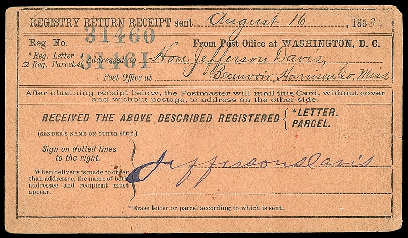Jefferson Davis, signature on Aug. 16th 1883 United States Post Office Dept. registry return receipt card, front side with "Beauvoir Miss. Aug 20" cds and instructions to return to the Chief of Engineers U.S. Army, blue registrations numbers; some corner creases and slight wear, Very Fine signature and most unusual on a Post Office return receipt.