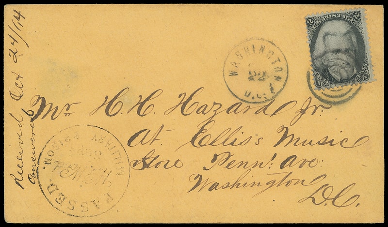 Old Capitol Prison, Washington D.C., mostly clear strike of " Passed W. P. Wood Supt. Military Prison " examiner's circular handstamp on orange prisoner-of-war drop cover bearing 2¢ black (73) , tied by four-ring cancel duplexed with "Washington D.C. Oct 22" cds, 1864 docketing at left, barely reduced at right, Very Fine, ex-Faust, Flannery .