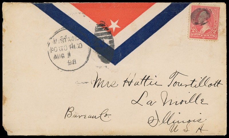 M. Sta. No. 1, Porto Rico, Aug 3 '98 (Playa de Ponce), military station duplex on Spanish American War patriotic cover bearing 2¢ rose pink (279Bc) , canceled by cork, addressed to La Moille Ill.; reduced slightly at left, 2¢ slight erosion, F.-V.F.