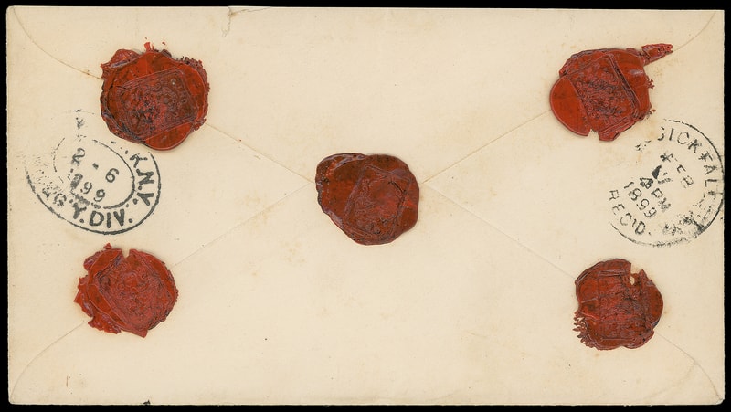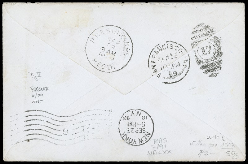 There are just ten covers recorded bearing the Coamo Provisions, of which three were sent by Captain Potts to his wife at San Francisco, these being the only covers extant sent abroad bearing a Coamo Provisional. As the stamp was only valid internally, it paid the portion of the journey from Coamo to Ponce, and this mail should have required 2¢ postage for onward transmission, but it was nevertheless accepted without additional franking by the military postal clerk.