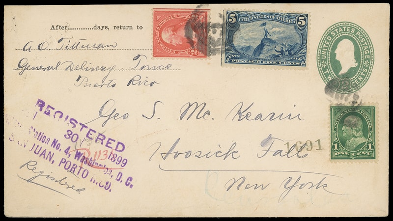 Registered, Jan 30 1899, Military Station No. 4, Washington D.C., San Juan, Porto Rico., purple four-line postmark on 2¢ green entire bearing 1¢ green (279) , 2¢ rose carmine (279Bc) and 5¢ Trans-Mississippi (288) tied by four-ring cancels endorsed from A.O. Tillman, Ponce P.R. to New York City, reverse with New York (2.6) transit and Hoosick Falls N.Y. (2.7) arrival, Very Fine and scarce San Juan registered use.
