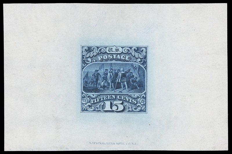 1869, 15¢ deep blue, type I, trial color large die proof, 74 x 49mm, National Bank Note Co. imprint at bottom, intense color, fresh and Extremely Fine, ex-Kuphal (European) ; with 1990 P.S.E. certificate.