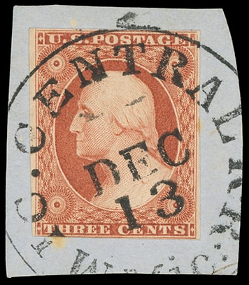 1851, 3¢ orange brown, type II, position 33R5E, large margins to barely touched at bottom, tied by sharp "Mic. Central R.R., Mic. Dec 13" railroad route agent cds on small blue piece, couple faint tone spots.