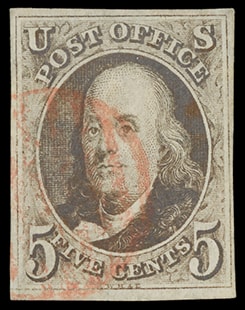 1847, 5¢ red brown, ample to large margins, deep shade, attractive red grid cancel.