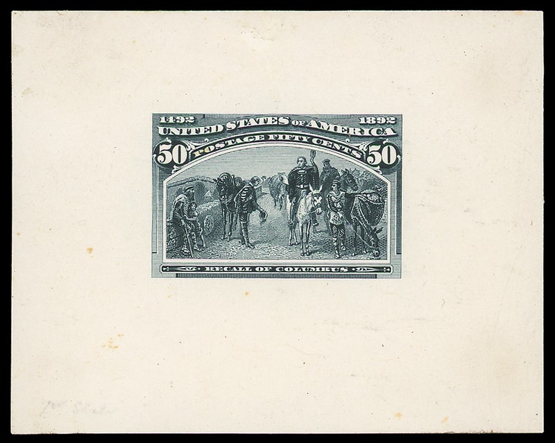 1893, 50¢ Columbian, slate blue, die essay on India, incomplete engraving of entire design; additional engraving on donkey's flank and face of figure to left of Columbus, mounted on 72x57mm card, Very Fine.