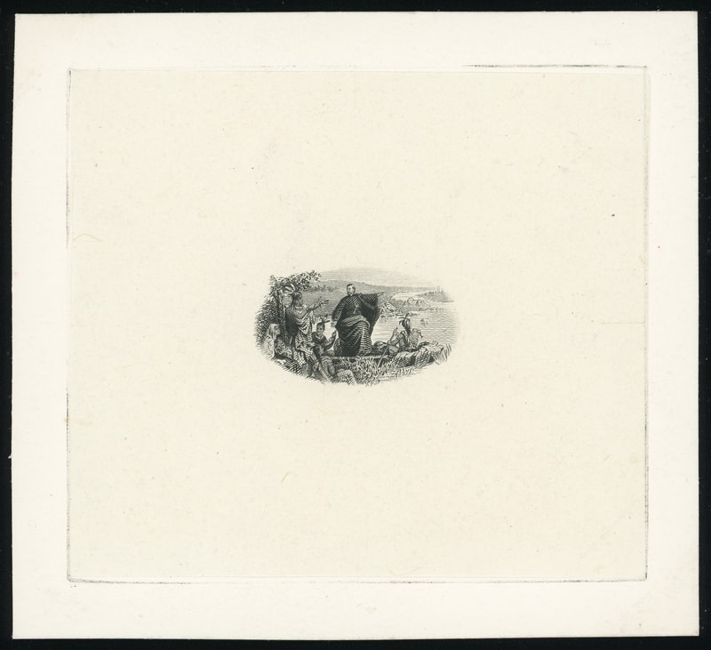 Incomplete vignette only die with further engraving of entire left side, Marquette's hair is significantly larger and reshaped, Indian at right darker and robe shadow etched.Lot 1308