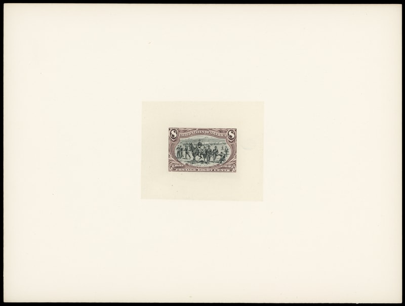 1898, 8¢ Trans-Miss. bicolor essay, dark red frame with black vignette on India, die sunk on full 200x156mm card, Extremely Fine and choice full-size example.