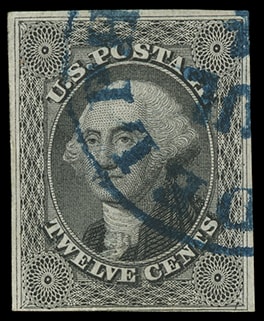 1851, 12¢ black, part India paper, position 25L, large margins to just shaving bottom frameline, intense shade nicely contrasted by bold blue Philadelphia Jul. 4 town cds, F.-V.F. and attractive; with 1979 P.F. certificate.